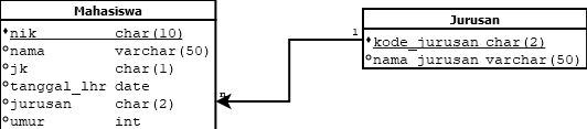 Kedua tabel tersebut adalah tabel mahasiswa dan jurusan, dimana keduanya memiliki hubungan (relasi) field yang menghubungkan keduanya adalah dari field kode_jurusan sebagai primary key (kunci utama)pada tabel jurusan berelasi dengan field jurusan pada tabel mahasiswa sebagai foreign key (kunci tamu).