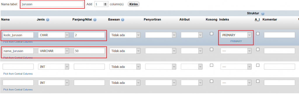 Isi setiap nilai pada kolom nama, jenis dan panjang/nilai serta index dengan memilih primary untuk field kode_jurusan.