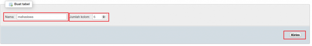 Kita akan buat tabel mahasiswa dengan jumlah kolom sesuai dengan desain yang sudah kita buat diatas yaitu berjumlah 6 kolom. Selanjutnya kita klik tombol kirim.